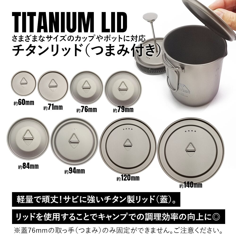 軽量で頑丈!サビに強いチタン製リッド(蓋)。当社製品をはじめ、さまざまなサイズのカップやポット、クッカーに対応可能。フタには便利なツマミ(取っ手)付き。 チタン蓋を使用することでキャンプでの調理効率の向上に。お湯を沸かしたり、料理をする時間の短縮にも。