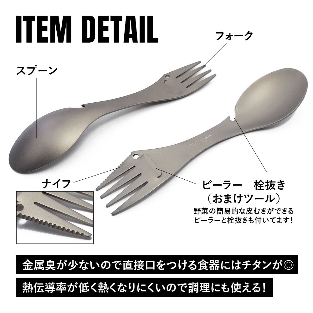 超軽量!頑丈!サビにも強い!スプーンとフォークとナイフが一体型になったチタン製3in1カトラリー。一本三役でソロキャンプやBBQなどで大活躍!これひとつあれば、キャンプで困ることなし!野菜の簡易的な皮むきができるピーラーと栓抜きとしての機能付き(おまけツール)。※おまけツールはあくまでもサブの機能となります。メインの機能ではございませんので、ご了承ください。チタンは熱伝導率が低く熱くなりにくい特長があるので、食事にだけでなく調理にも使えます!金属特有の金属臭が少ないので、直接口をつけるカトラリーにはチタン製がおすすめ!耐食性が高いので濡れたままでも錆びてしまう心配なし!
