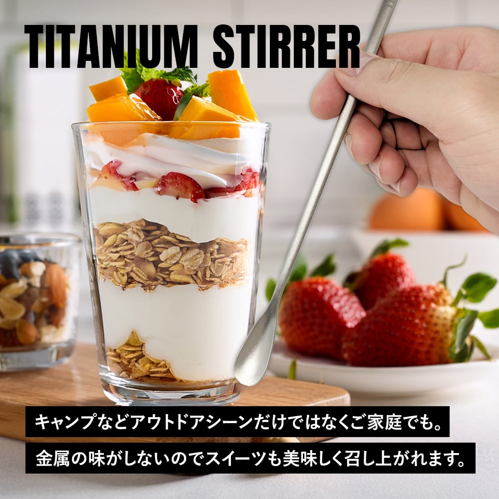 チタン製で金属特有の嫌な金属臭がしないので、お酒や飲み物の風味を損ないません。金属の味もしないので、デザートやスイーツ用のパフェスプーンとしても。ダイニングやリビングなどご家庭での普段使いから野外・屋外でも、軽量で頑丈なチタンマドラーは末永くお使いいただけます。
