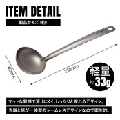 超軽量で頑丈!ソロキャンプ時の使用にちょうど良いサイズ感で、具材だけを取り出すのに適した錆に強い軽量タイプのチタンレードル(おたま)。チタン製で焚き火やバーナーなど直火に対応可能。お玉の先端はクッカーや鍋の側面にフィットしやすい楕円型なのですくいやすい。