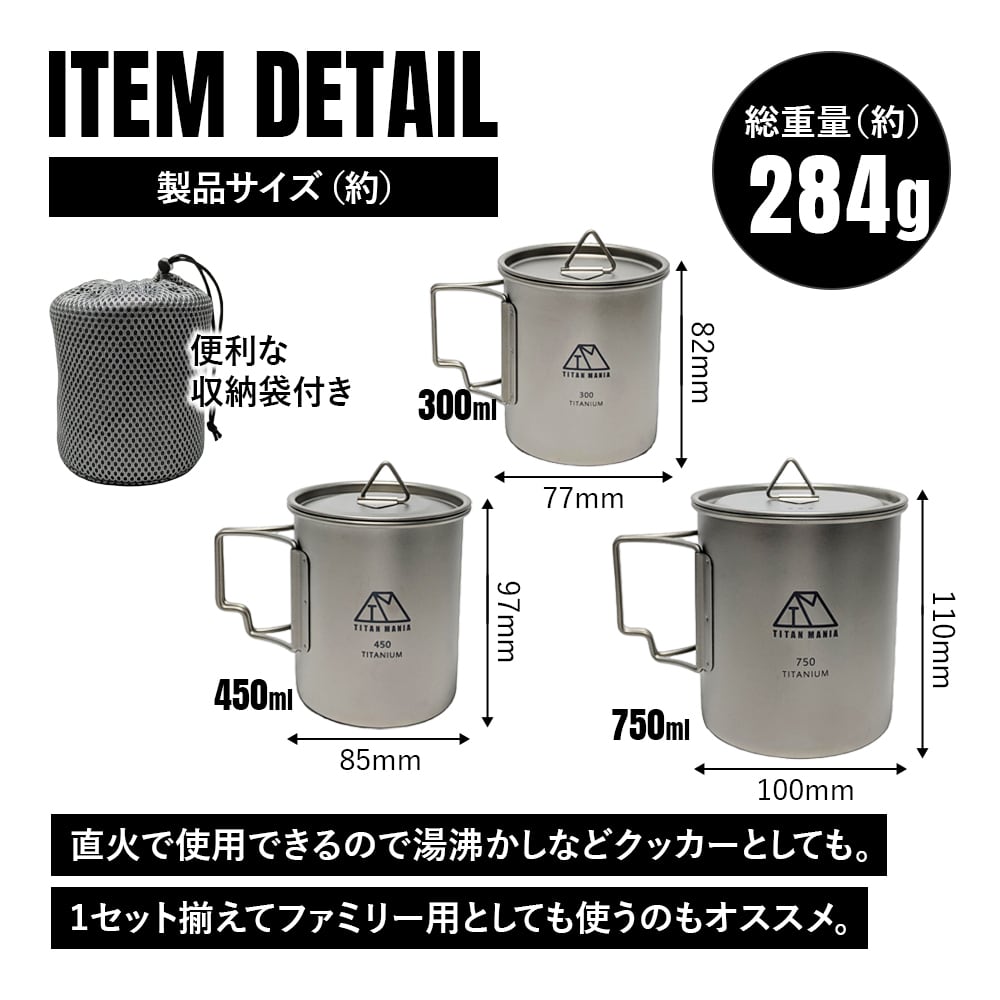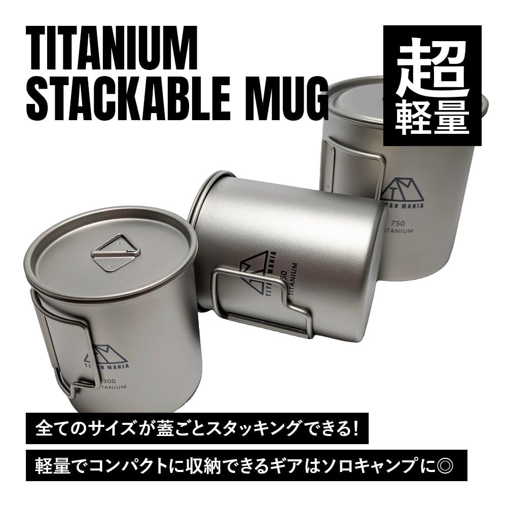 【アウトレット】マグカップ チタン製 蓋付き 300/450/750ml 3点セット 全てのサイズが蓋ごとスタッキング出来る 超軽量 折りたたみハンドル 直火 錆びない キャンプ ソロキャンプ アウトドア用品 キャンプ用品 収納袋付き | TITAN MANIA(チタンマニア)公式オンラインストア