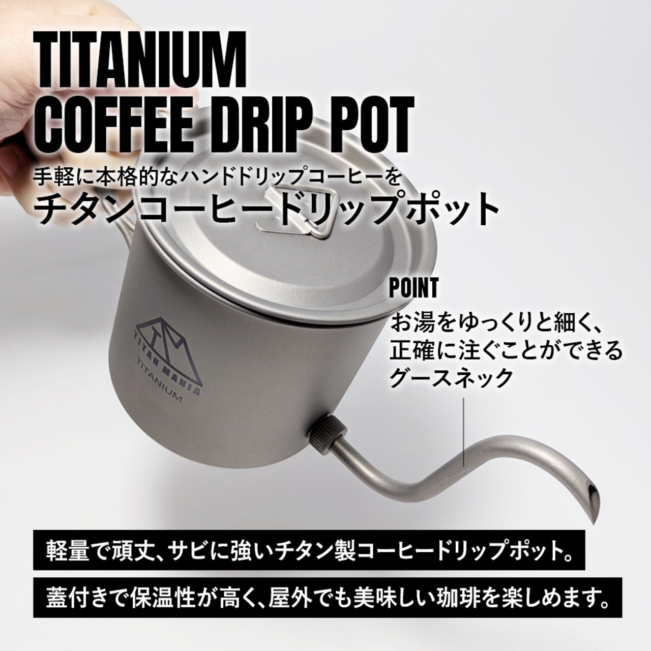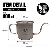 軽量で頑丈、サビにも強いチタン製コーヒードリップポット。お湯をゆっくりと細く注ぐことができるグースネックは取り外し可能。ハンドルが折りたたみ式でコンパクトに収納可能。蓋のツマミ(取っ手)は固定が可能。携帯性が高く装備を軽量化できるチタンギアは登山やソロキャンプなどウルトラライト(UL)キャンプにおすすめ。