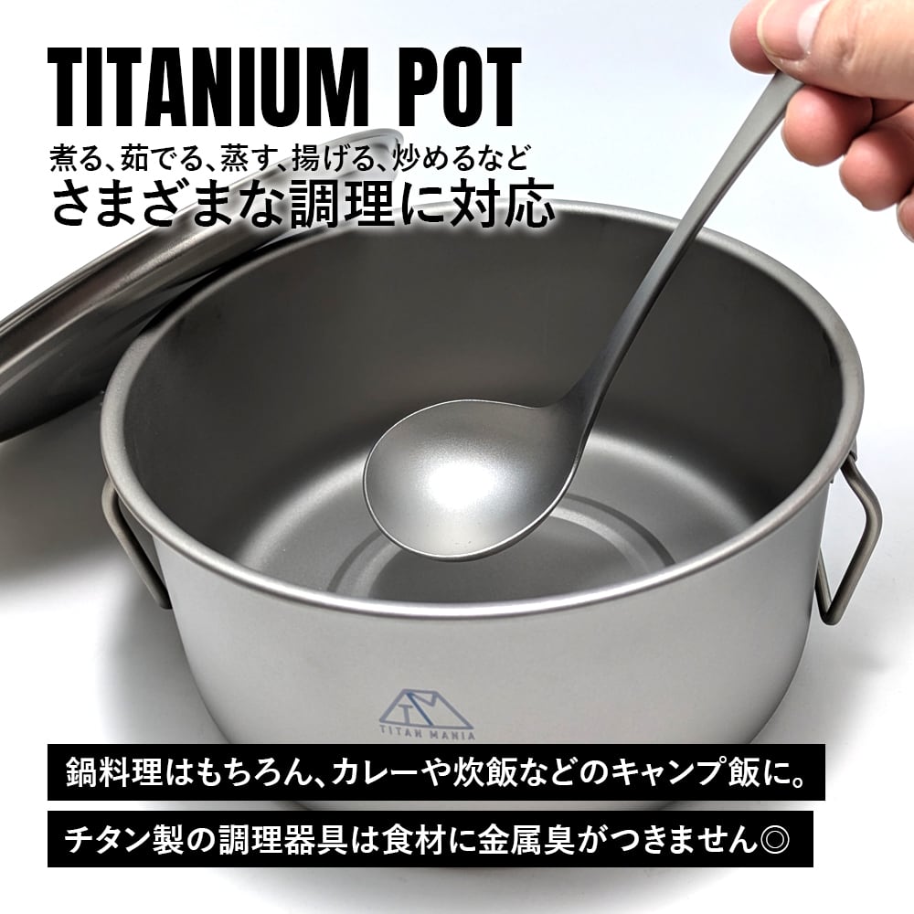 軽量で頑丈、錆にも強いチタン製ポット(鍋)。2〜3人前用の蓋付きのお鍋。ソロキャンプはもちろんファミリーキャンプやグループでのキャンプにも対応可能。鍋料理、カレー、おでんや煮物、炊飯など様々な調理に。間口が広いので食材が入れやすく、煮る、茹でる、蒸す、揚げる、炒めるなど効率よく調理ができます。