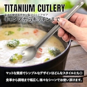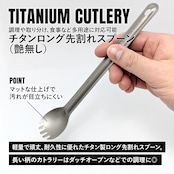 軽量で頑丈、錆にも強いチタンカトラリー(ロングタイプ)。柄が長い調理器具はダッチオーブンなどでの調理に便利。調理や取り分け、食事など多用途に対応可能。大きめのクッカーや深めのポットでの食事に便利。チタンは食材に金属臭がついてしまうことがなく、食べ物の風味を損ないません。艶有りタイプには見た目も美しい鏡面加工。口当たりが良く、食べやすい。
