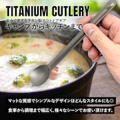 軽量で頑丈、錆にも強いチタンカトラリー(ロングタイプ)。柄が長い調理器具はダッチオーブンなどでの調理に便利。調理や取り分け、食事など多用途に対応可能。大きめのクッカーや深めのポットでの食事に便利。チタンは食材に金属臭がついてしまうことがなく、食べ物の風味を損ないません。艶有りタイプには見た目も美しい鏡面加工。口当たりが良く、食べやすい。