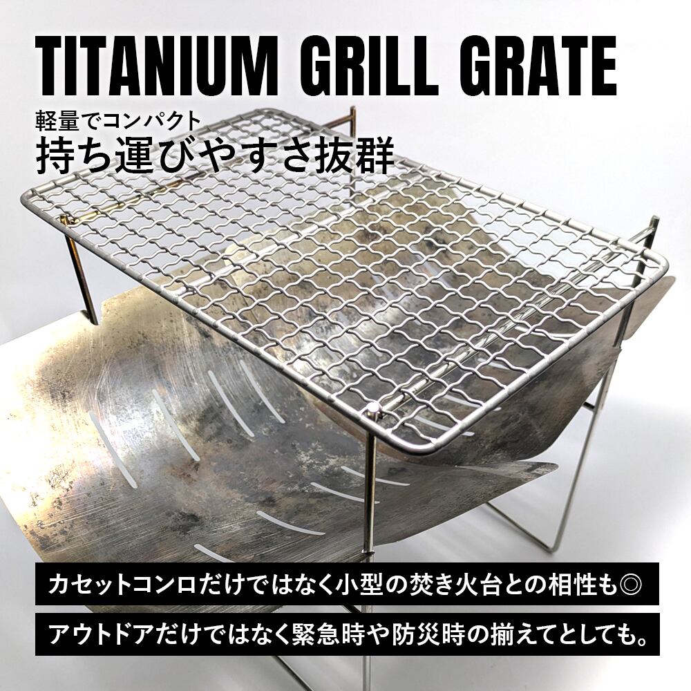 優れた耐食性でサビに強く、焚火の熱でも変形してしまわない優れた耐久性があります。頑丈なチタンのアミは安定性があるので、スキレットやフライパン、クッカーを載せて調理することも可能。イワタニカセットコンロの交換用の網としてだけではなく、ソロキャンプ用の小型のコンパクトな焚き火台等と合わせて使いやすいサイズ感。焚き火、かまどやグリルなどの五徳(スピット)としても。