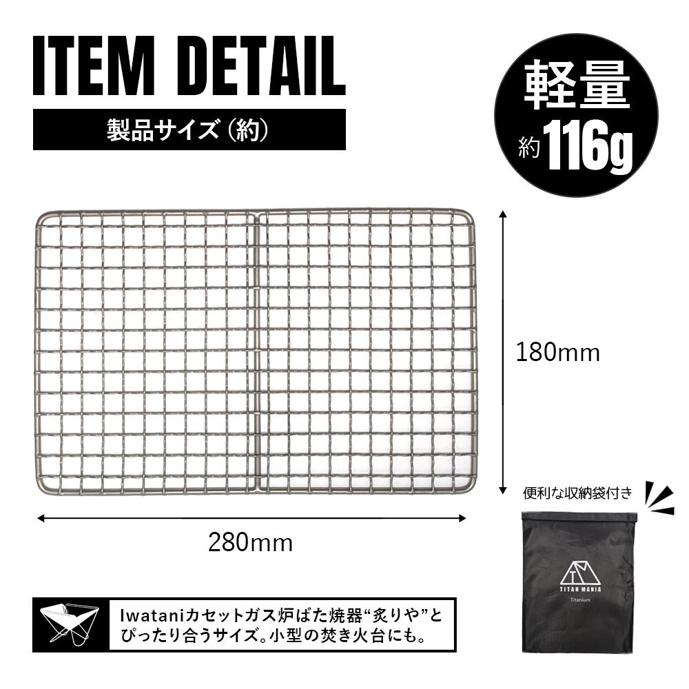 【アウトレット】焼き網 網 炙りや対応 チタン製 28x18cm イワタニ 炙りや用 炉ばた焼器用 軽量 角型 万能 頑丈 28cm 280mm ネット ソロキャンプ BBQ アウトドア用品 キャンプ用品 持ち運び便利 収納袋付き | TITAN MANIA(チタンマニア)公式オンラインストア