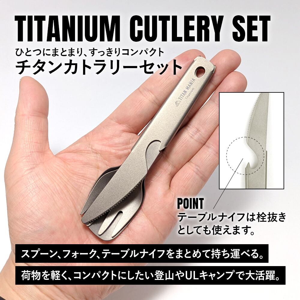 【アウトレット】スプーン フォーク テーブルナイフ カトラリー チタン製 3点セット 軽量 頑丈 携帯 吊り下げ 調理器具 登山 キャンプ ソロキャンプ アウトドア キャンプ用品 収納袋付き | TITAN MANIA(チタンマニア)公式オンラインストア
