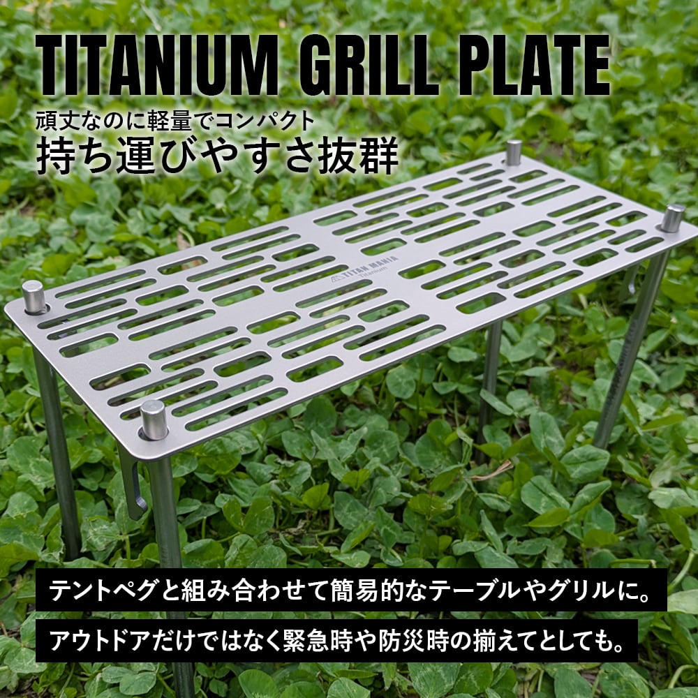 軽量で頑丈、錆にも強いチタン製グリルプレート(網S)。チタン製の網は肉やステーキ、野菜を焼くなど様々な調理に対応可能。厚さ2mmの鉄板は焼きムラが少なく均一に加熱できます。チタンは金属特有の嫌な金属臭がしないので食べ物の風味を損ないません。焼き網としてだけではなくバーベキューコンロなどの五徳(スピット)としても。