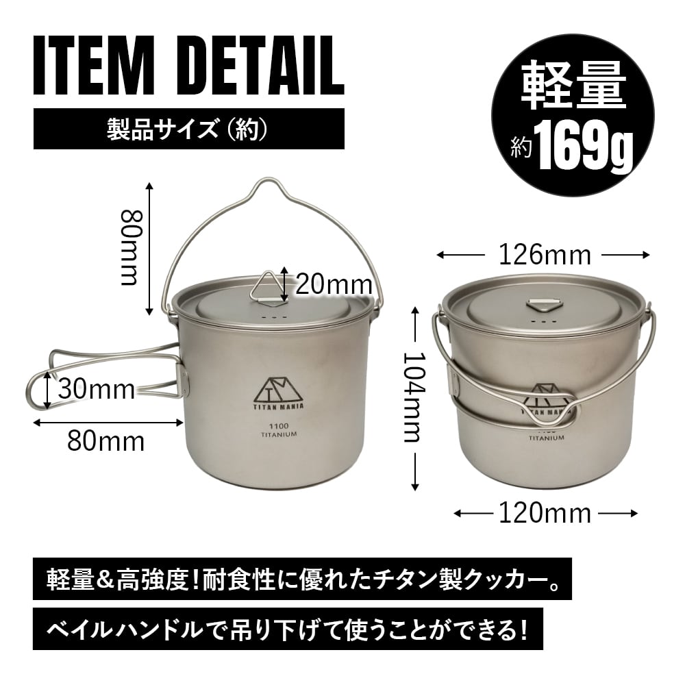 1100mlクッカー チタン製 吊り下げ式 ベイルハンドル 蓋付き 折り畳みハンドル付き 超軽量 頑丈 直火OK ポット コッヘル 調理器具 ソロキャンプ BBQ バーベキュー アウトドア キャンプ用品 収納袋付き | TITAN MANIA(チタンマニア)公式オンラインストア