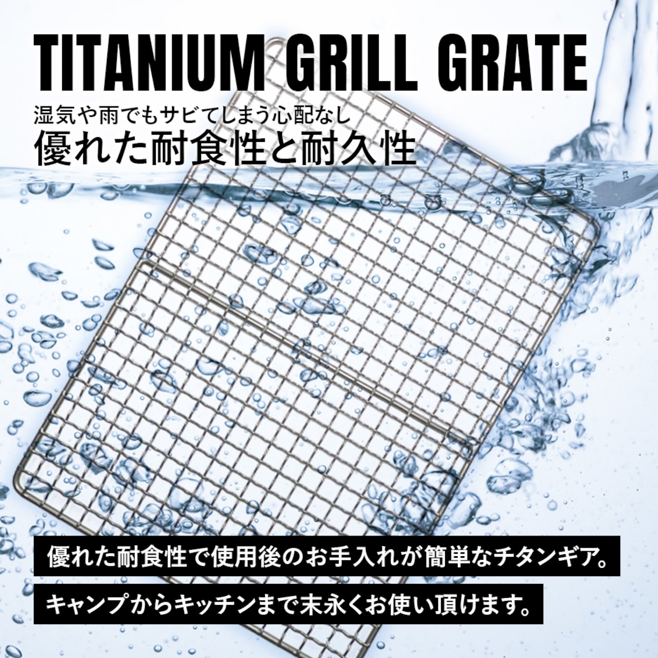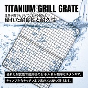 優れた耐食性でサビに強く、焚火の熱でも変形してしまわない優れた耐久性があります。大きくて頑丈なチタンの焼網は安定性があるので、スキレットやフライパン、クッカーを載せて調理することも可能。焚き火はもちろん、ソロキャン用のコンパクトな焚き火台から中型のバーベキューコンロ等と合わせて使いやすいサイズ感。かまどやグリルなどの五徳(スピット)としても。