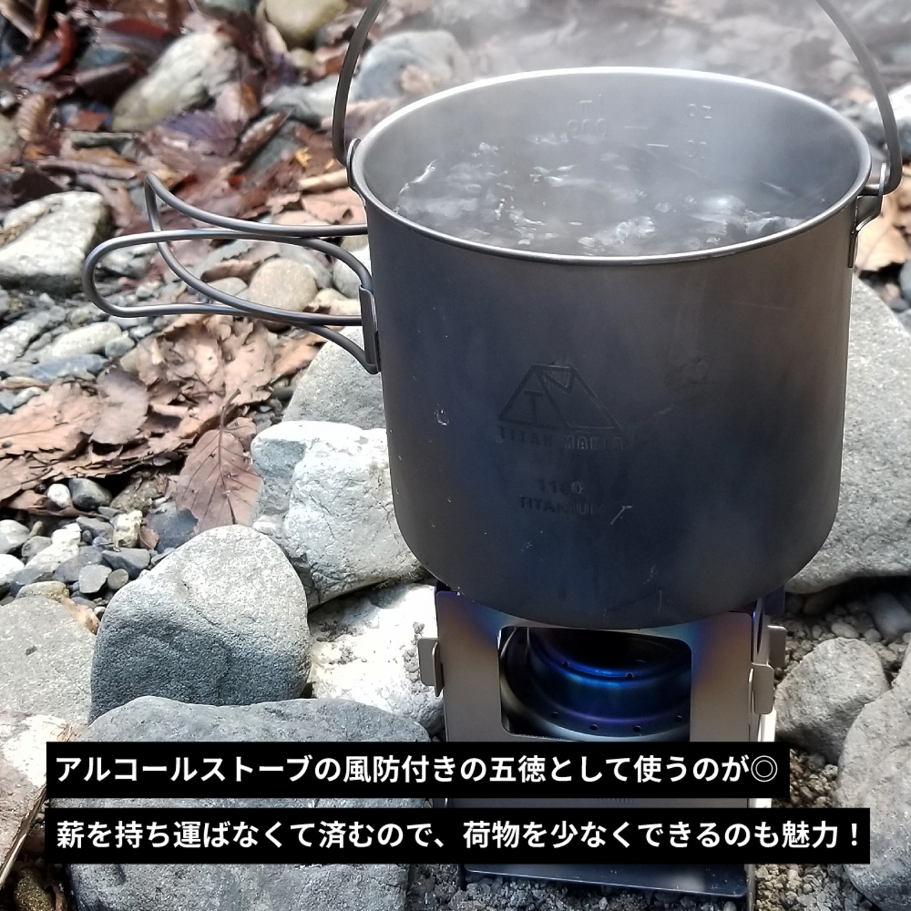 ■軽量!頑丈!錆びにくい!ソロキャンプやBBQなどアウトドアで一つは持っておきたいチタン製ミニ焚き火台。別売りのアルコールストーブがぴったり設置できるサイズなので五徳コンロとして大活躍すること間違いなし! ゴトクがついているのでお湯を沸かすことはもちろんメスティンで炊飯やフライパンや鍋などクッカーでしっかり調理することが可能!