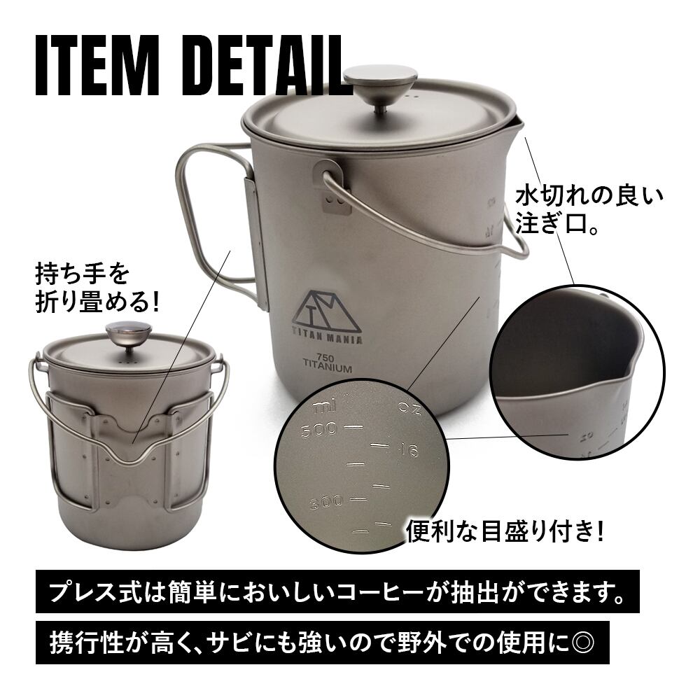 【アウトレット】フレンチプレス チタン製 750ml 軽量 頑丈 直火 ベイルハンドル付き コーヒー コーヒープレス クッカー ポット パーコレーター 調理器具 ソロキャンプ アウトドア キャンプ用品 収納袋付き | TITAN MANIA(チタンマニア)公式オンラインストア