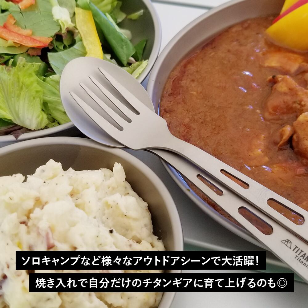 使い勝手の良いサイズ感で様々なアウトドアシーンで大活躍!軽量で携帯性も高いので、ギアを増やしたくないソロキャンプにおすすめ! 直火での使用も可能なので焼き入れで自分だけのチタンギアに育て上げるのも◎チタンギアは使うほどにチタン特有の美しい焼き色へと変化していく!