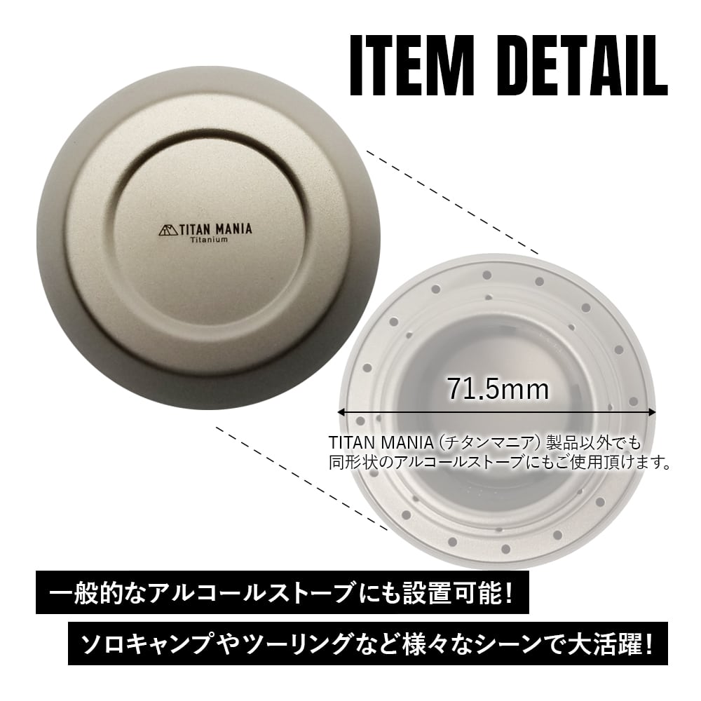 ■一般的なアルコールストーブにも設置可能!調理など使用中に途中で消火させることが可能。アルコール燃料の節約にもなります!ソロキャンプやバイクツーリング、登山や釣りなど様々なアウトドアシーンで大活躍!TITAN MANIA(チタンマニア)製品以外の同形状のアルコールストーブにご使用頂けます。