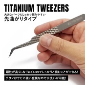 軽量!頑丈!錆にも強いチタン製ピンセット。極小パーツにも対応できる精密タイプ!シャープな先端は細かい作業に特化した極細設計。本体は滑りにくいデザイン。先端は非常に鋭利で細いので、小さな物をしっかり摘まむことができます。剛性が高くしなりにくい本体なので、しっかりと掴むことができます。角度のついた先曲がりタイプは大きなパーツもしっかり掴みやすい!