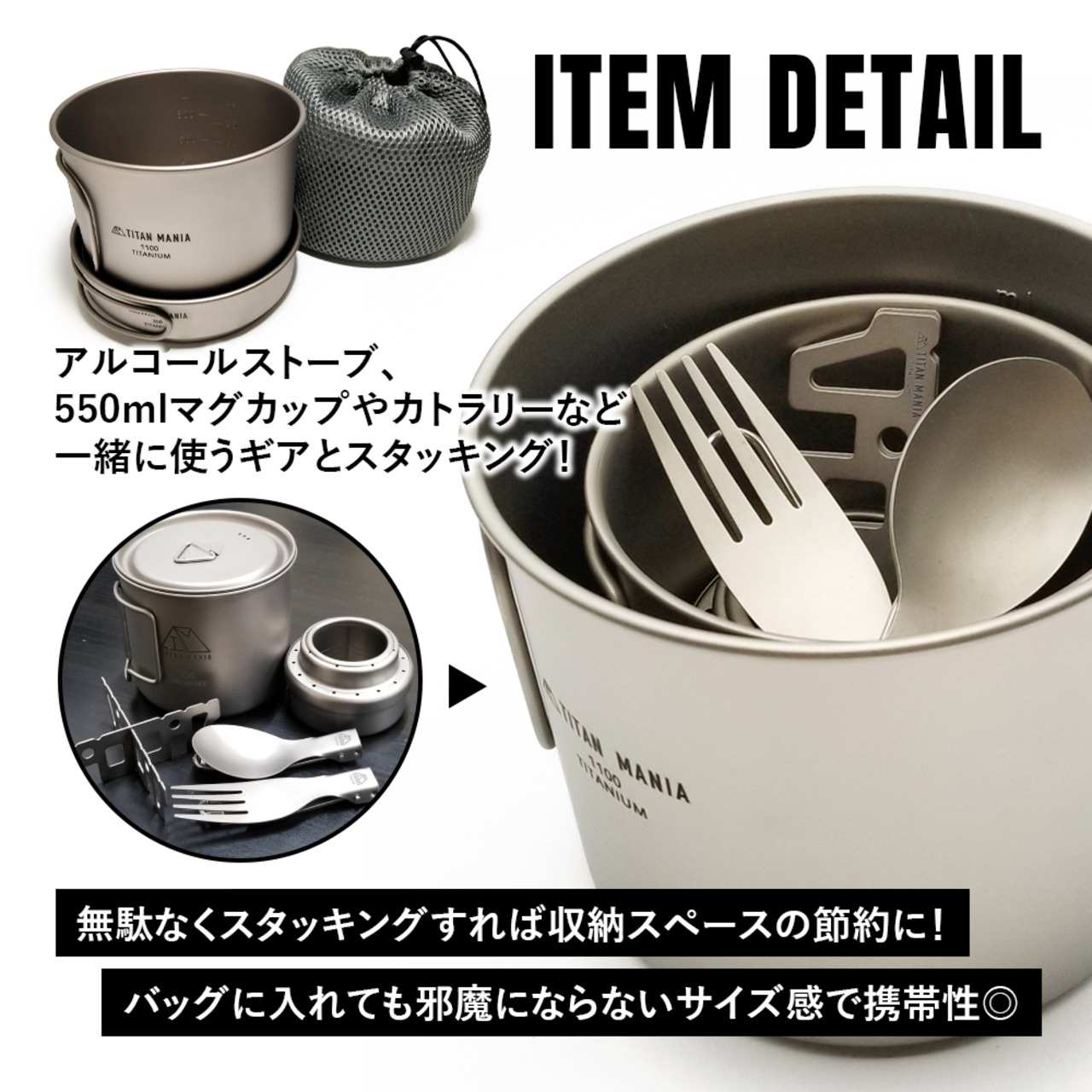 軽量!頑丈!錆びにくい!ソロキャンプやBBQなどアウトドアで一つは持っておきたいチタン製クッカーセット(1100ml+350ml)。焚き火やバーナーなど直火で使用できるので炊飯や湯沸しはもちろん、インスタントラーメン、カレー・スープなど様々な料理の調理に対応できる!