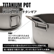 軽量で頑丈、錆にも強いチタン製ポット(鍋)。2〜3人前用の蓋付きのお鍋。ソロキャンプはもちろんファミリーキャンプやグループでのキャンプにも対応可能。鍋料理、カレー、おでんや煮物、炊飯など様々な調理に。間口が広いので食材が入れやすく、煮る、茹でる、蒸す、揚げる、炒めるなど効率よく調理ができます。